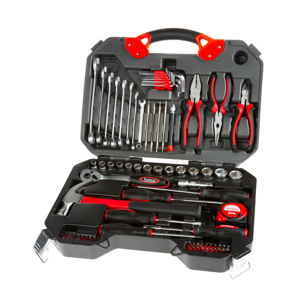 Valise ABS rigide 3 pinces, 2 tournevis plats, 2 tournevis cruciformes, 1 clé à cliquets + 14 douilles, rallonge 3/8'', 9 clés Allen, 8 clés mixtes, 30 embouts tournevis, 1 manche tournevis, 4 lames pour tournevis préc