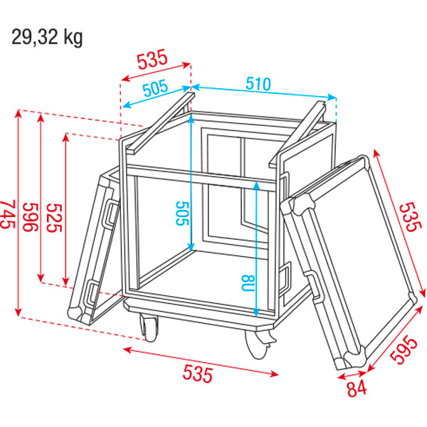 Dimensions (LxlxH) : 535x595x596mm Support horizontale inclinable - 4 roulettes diamètre 100mm dont 2 avec freins
